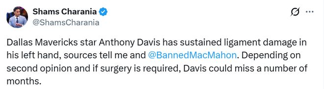 北京时间1月10日,据名记Shams报道,达拉斯独行侠球星安东尼-戴维斯左手韧带遭遇损伤。根据二次诊断结果以及是否需要接受手术,戴维斯可能缺席长达数月的比赛。
