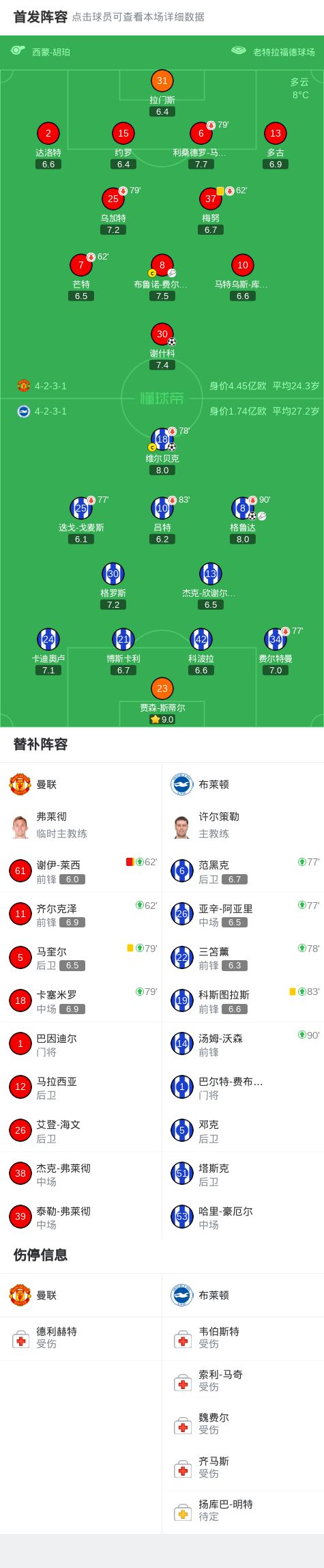 - 曼联1-2布莱顿,格鲁达传射建功,谢什科破门,莱西染红