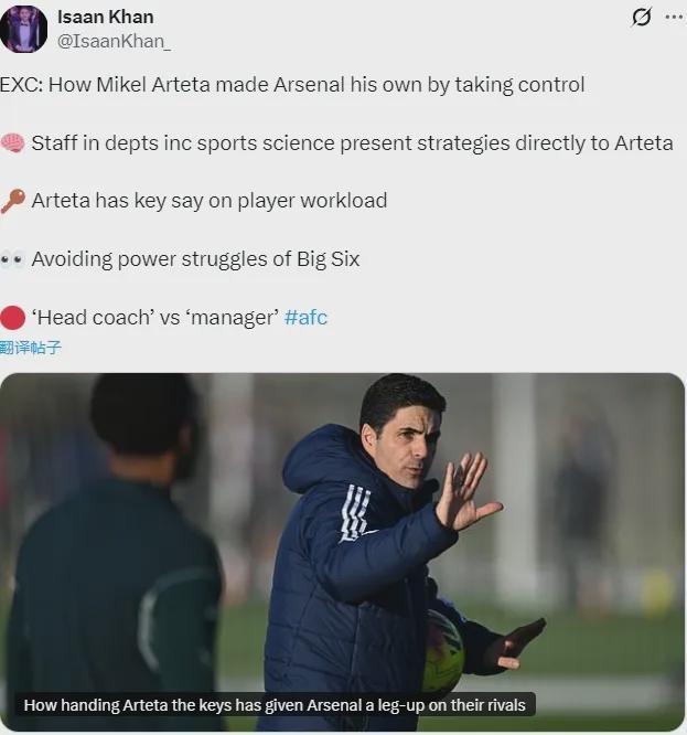 邮报记者IK发文表示,阿尔特塔是英超仅存的6名“足球经理”之一,而且是其中最年轻的(43岁),在很多关键领域,阿尔特塔的参与不仅很受欢迎,而且在意料之中,这种参与在英超目前日益行政主导的大环境下是很罕见的。
