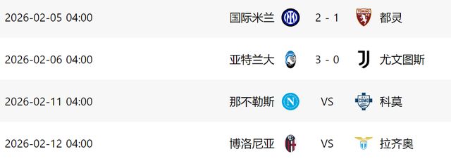 - 2026年02月06日 无缘四强!尤文0-3亚特兰大 布雷默送点小孔塞桑中楣斯卡马卡点射