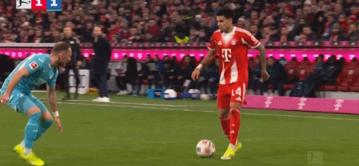 第89分钟,迪亚斯禁区前内切低射破门上演帽子戏法,拜仁5-1
