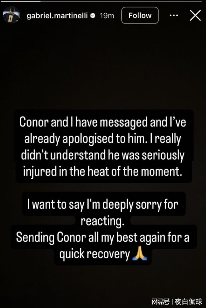 “我想为自己当时的过激反应深表歉意,再次祝愿康纳早日康复。”声明末尾还附上了一个祈祷表情。